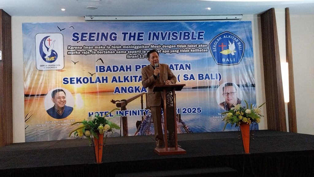 Sesudah menghadiri Penamatan Sekolah Alkitab Palembang Angkatan 40 sehari sebelumnya di Palembang, Bapak Ketua Umum Majelis Pusat GPdI Pdt. Dr. Johnny W Weol, M.M, M.Th hadir di Bali Rabu 28 Mei 2025 menyampaikan khotbah pada Ibadah Penamatan Sekolah Alkitab Bali.
