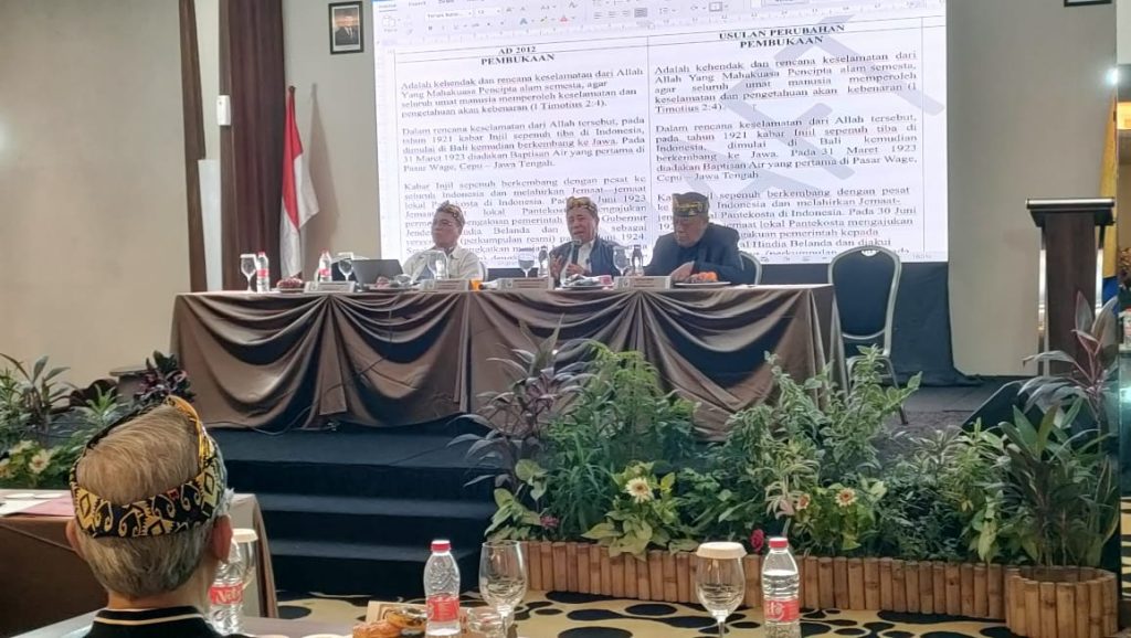Sebelum sesi pembahasan Bapak Ketua Umum memberikan pengantar sekaligus menunjuk pak Elim Simamora dan Pdt. Dr. Adi Sujaka, M.Th untuk memimpin sesi rapat pembahasan draft ad/art. Keduanya ditunjuk dalam kapasitas Ketua Kajian draft perubahan AD/ART dan Dr. Adi Sujaka Perumus sekaligus sebagai sala seorang penandatangan AD/ART yang berlaku saat ini.