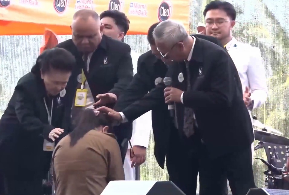 Sebelum doa penutup oleh Pdt. John Awuy, S.Th Kumtua Desa Klabat Joaneke Dotulong, SIP yang berulang tahun tepat hari ini didoakan di atas panggung di hadapan seluruh peserta Youth Camp.