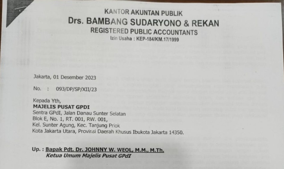 Sebagai wujud komitmen Majelis Pusat pada akuntabilitas, laporan keuangan MP GPdI 2024 telah diperiksa oleh kantor akuntan publik. Agar semua pihak memahami bahwa dalam hal keuangan Majelis Pusat mengedepankan transparansi. Jasa akuntan public yang melakukan audit keuangan Majelis Pusat adalah Kantor Akuntan Publik Drs. BAMBANG SUDARYONO & REKAN REGISTERED PUBLICS ACCOUNTANTS
