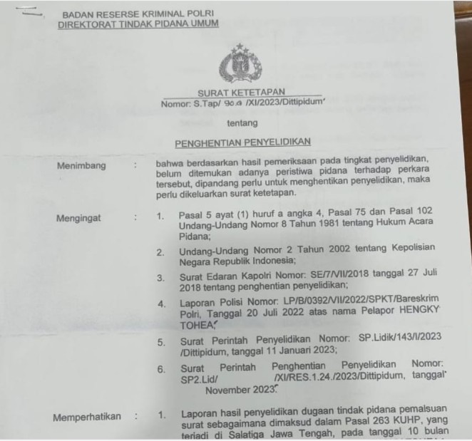 Seseorang melaporkan dugaan pemalsuan tanda tangan Dirjen ke Bareskrim Mabes Polri, sementara Prof. Thomas Pentury melapor ke Polda Metro Jaya.