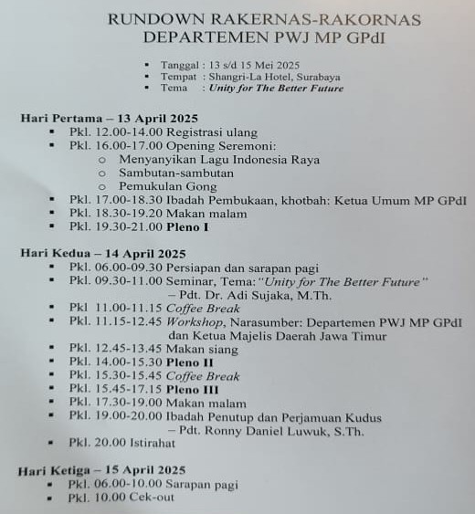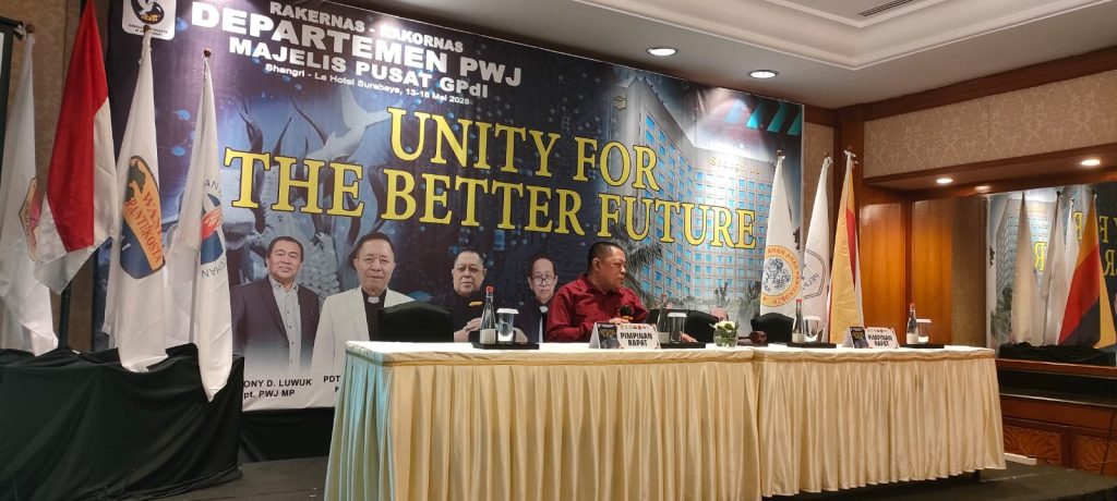 Pdt. Rex Winarno selaku Ketua Panitia tampak serius memonitor jalannya helat nasional PWJ 13-15 Mei 2025. Keseriusan yang tetap dipadu dengan keramahan dan senyum menyapa peserta mencerminkan semangat beliau untuk perwujudan harapan hari depan yang lebih baik di dalam kesatuan. Soliditas panitia dalam koordinasi sang ketua menjadi realitas terkini yang menginspirasi peserta untuk bergerak dalam semangat persatuan.